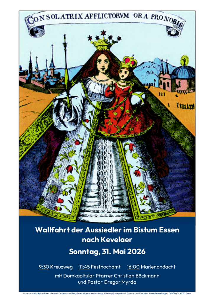 Am Sonntag, 31. Mai 2026 findet die Wallfahrt Wallfahrt der Aussiedler im Bistum Essen nach Kevelaer statt.